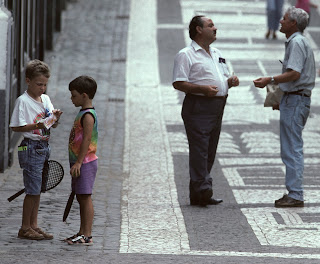 Jim Bryant, a photojournalist and master of photography, shares a blog article called Human Contrast. His images are fantastic, and one in the series stood out to me. It is a street scene, two young boys holding tennis rackets between their legs, face to face, discussing whatever it is that little boys talk about. To their right, and farther away in the picture, are two men, discussing the things men discuss, drawing a perfect parallel with the two boys. An amazing shot to be sure, and one that makes me think.